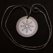Přívěsek z lávového kamene, barva černá, s černou šňůrkou. Energetický symbol z posvátné geometrie zvyšující vibrace. Velikost 43 mm.