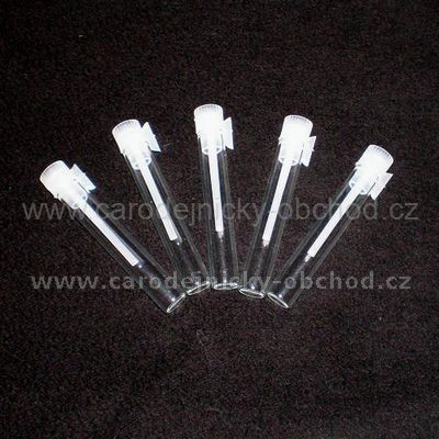 Skleněná lahvička s umělohmotným zacvakávacím uzávěrem, na tekuté věci (oleje, tinktury). Obsah 1 ml - 5 kusů.